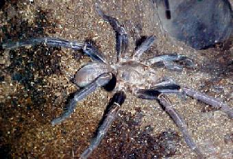 Haplopelma lividum These are fiesty yet very shy bugs with legs that appear black under certain lighting and then seem to be a deep metallic blue at another angle. Note also the long and thick rear legs. Their abdomens are grayish and they have gray to coffee-colored carapaces. Their undersides are black. The mature males are less spectacular and sport brownish carapaces and dark, striped legs that don't have as much of a bluish tint. |
