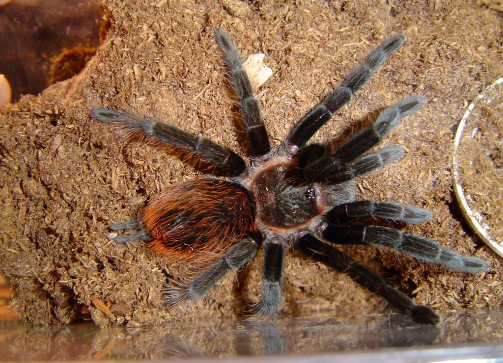 Brachypelma vagans This species has the widest range of all Brachypelma species, from the Yucatan peninsula to northeastern Costa Rica. As a result, they are very adaptable to a variety of environmental conditions. B. vagans reproduces easily, grows more quickly than the more "desert-oriented" species of Brachypelma, and is therefore readily available as captive bred. There are several color variations throughout its range, and individual specimens go through coloration changes throughout their lives. All the photos on this page are from a single individual. |