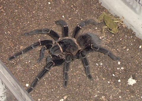 Food: Crickets, small lizards, pinkie and fuzzy mice, your mother-in-law, the kitchen sink. . . . Seriously, these spiders will eat just about anything smaller than they are, and lots of it. In the wild, they are regular consumers of small vertebrates, and my 5 1/2" youngster eats pinkie mice like they're potato chips (my larger one eats EVERYTHING, to include fuzzy mice, crickets, hissing roaches, lizards, and even fish released into her water bowl). Simply ensure that what you offer them hasn't been exposed to pesticides and isn't very adept at defending itself. Be prepared to never be able to satisfy the little monster, and to always clean up food remains.